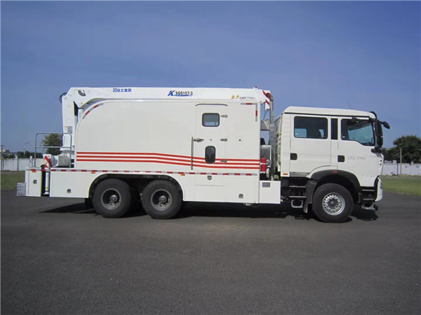 The test mast truck is modified on a HOWO ZZ5357TXFV464MF5 Type II truck chassis manufactured by China National Heavy Duty Truck Group Jinan Truck Co., Ltd. It adopts a 6×4 drive configuration. The main specialized equipment includes a winch, an engine power take-off (PTO) system, and other auxiliary facilities.